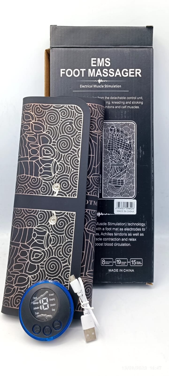 Experience ultimate relief with the EMS Foot Massage, designed to soothe and rejuvenate your ankles and feet. This modern, corded electric device combines silicone and leather materials for durability and comfort.